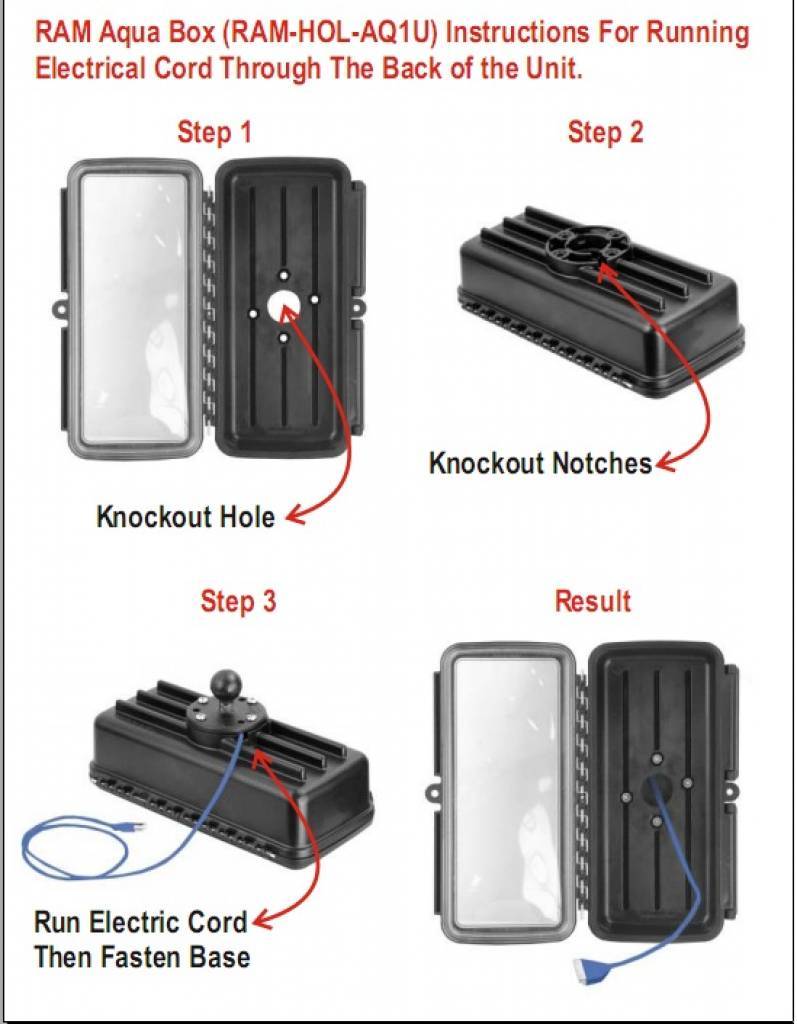 Use a RAM-B-202 to attach to the round indentation on the back of the AquaBox. Any power/data cables are also routed out here.