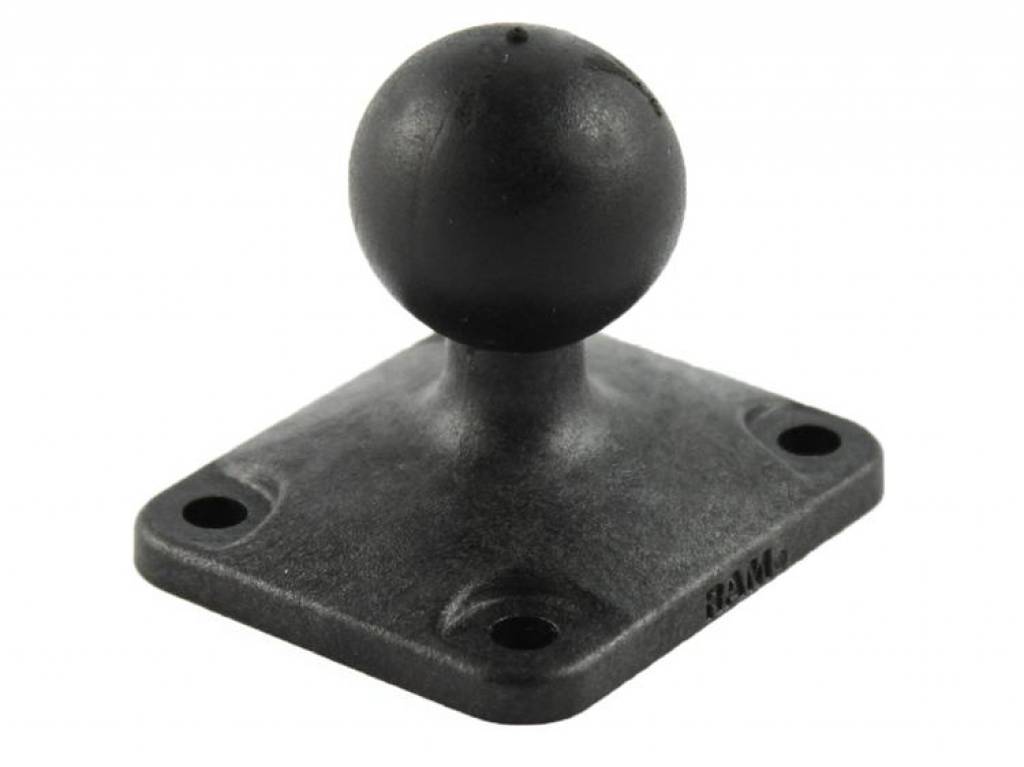 The RAP-B-347U base consists of a 1" diameter rubber ball connected at right angles to a 2" x 1.7" square base. The base has four pre-drilled holes at each corner, making the universal 1.5 x 1.188 (hole spacing) AMPS hole pattern.