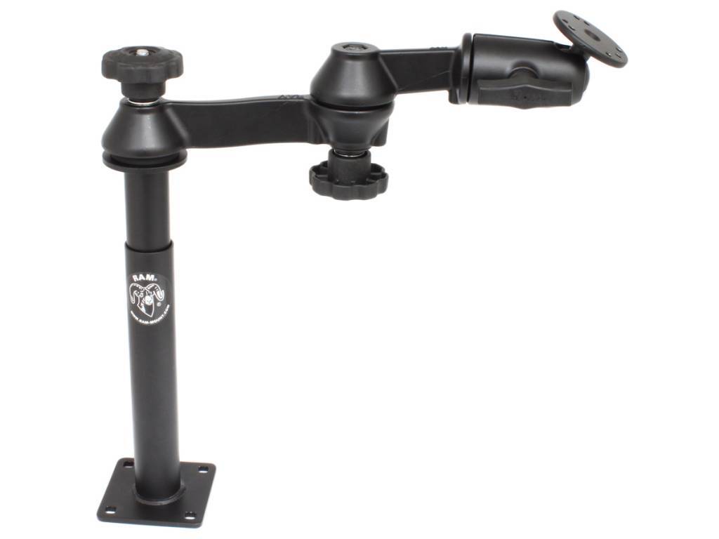 The RAM RAM-VP-SW1-89, combination swing arm/tele-pole™ system, will connect to any RAM vehicle base without a welded female tele-pole™. Included is a tele-pole™ with a height range from 11.5" to 17"; it can be easily adjusted by turning the knob at the top of the post. Once the knob has been tightened, the tele-pole™ becomes a rigid support for any RAM cradle, holder or Tough-Tray™.