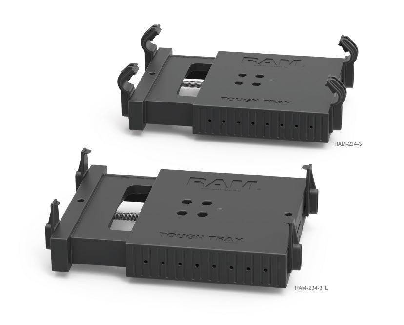 The RAM Tough-Tray™ is spring loaded expandable tray that can accommodate 10 to 16 inch wide laptops. The tray includes four FLAT (4) side clamping arm; they allowing for your laptop to close completely while in the tray.. These arms can be moved both vertically and horizontally. This allows for a custom fit for varying thicknesses of laptops and the freedom of not blocking ports or drives. Hole patterns on perimeter of tray facilitate the mounting of additional RAM systems to support GPS, PDAs or other electronics.