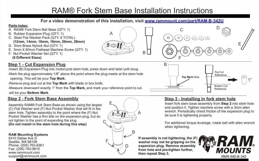 The RAM fork stem mount is one of the cleanest ways to mount small electronics on your motorcycle. Simply slide the assembly into the hole of the stem and tighten the machine screw to create a tight fit. This part is designed to fit into the cylindrical bore wall of fork stems and will work with stems that measure from 12 -20mm and 28mm or .5” – 1.10” at the following intervals:
