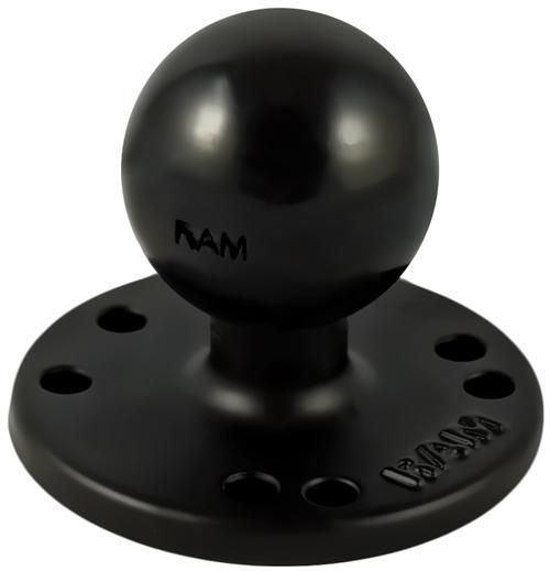 The RAM-202U consists of a 1.5" diameter rubber ball connected to a flat 2.5" diameter base. This mount has pre-drilled holes, including the universal AMPS hole pattern.