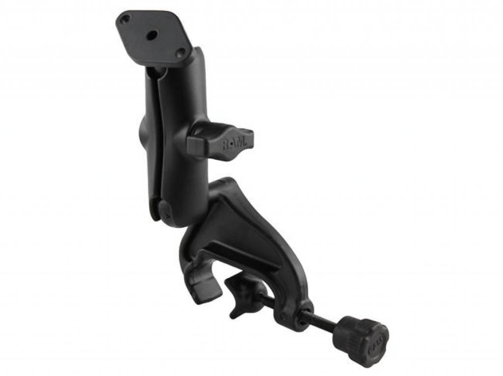 RAM-B-121-202U: gepoedercoat aluminium schroefklem (yoke clamp) met vaste rubberen B-kogel. voor stuurstangen tussen 1.6 en 3.2 cm diameter The 1" rubber ball is at a right angle to the plane of the mount so when connected to a rail, the ball sits parallel to the rail.