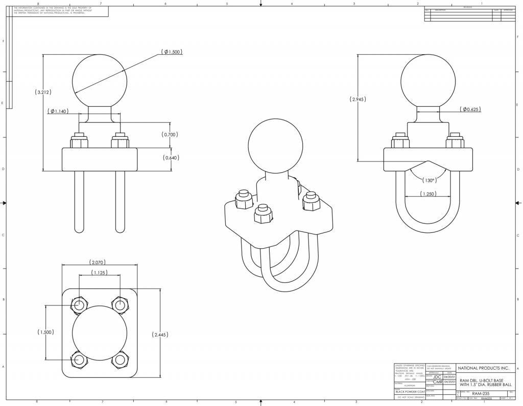 The RAM-235U consists of a stainless steel double u-bolt base connected to a 1.5" diameter ball. The double u-bolt base will accommodate rails from 1" to 1.25" in diameter.
