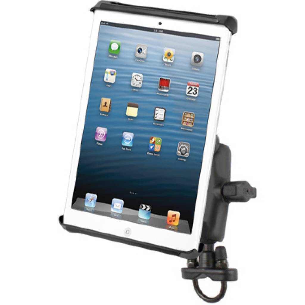 Consists of a stainless steel u-bolt base, double socket arm and non-locking cradle for 10 inch tablets. Designed into the mount is a 1" diameter patented rubber ball and socket system with adjustment points at the base and cradle. With a twist of the arm knob, you can move the tablet rail mount to your optimum viewing position. Included in this package is hardware that will accommodate rails from 0.50" to 1.25" in diameter.