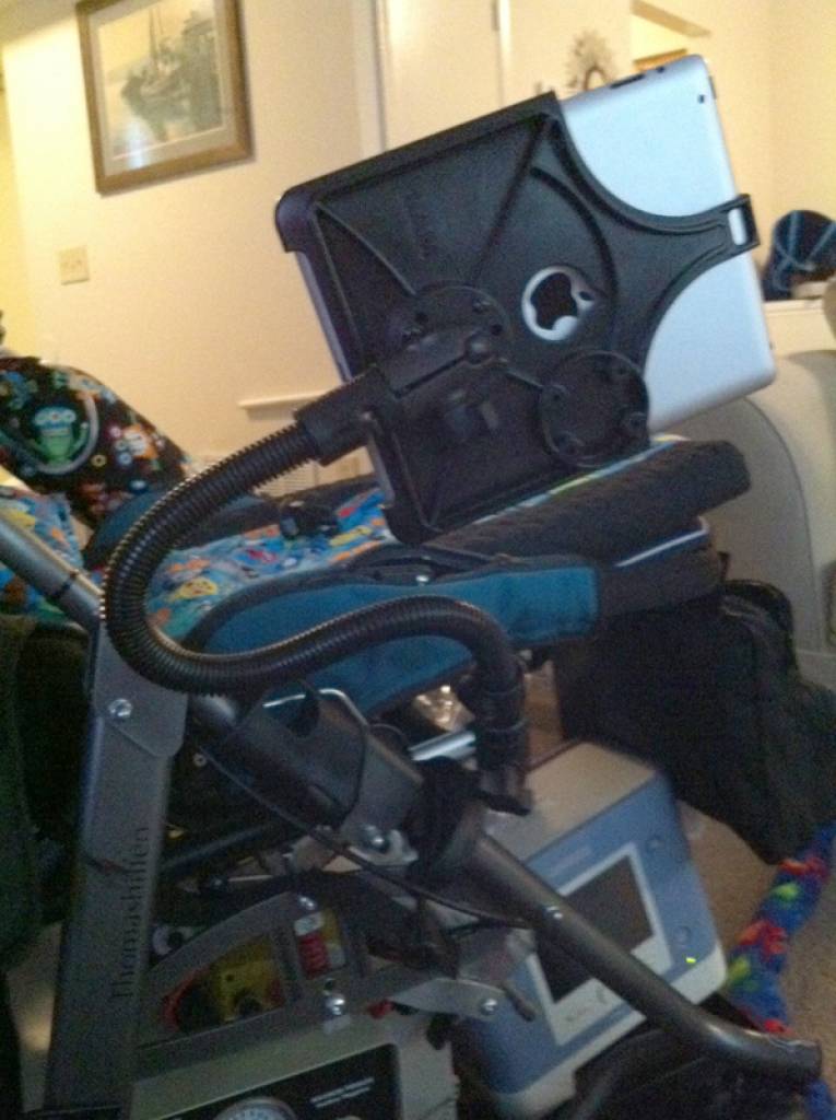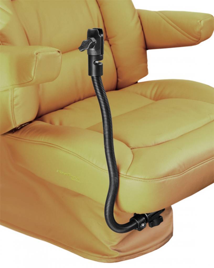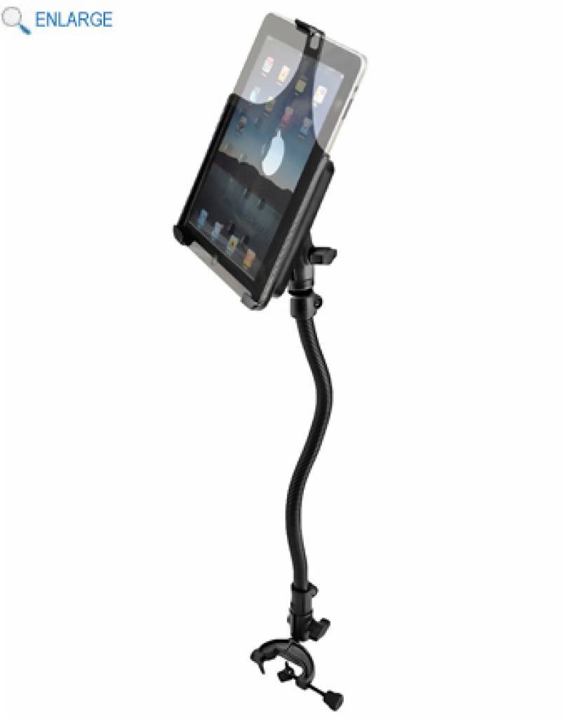 The EZ-ON/OFF™ flexible seat clamp mount consists of a universal clamp base, 18" (48 cm) flex rod, single socket mounting system and custom high strength composite cradle for the Apple iPad and iPad 2. The clamp base is modular in design; it can easily be attached to tubes and rectangular surfaces, ranging from from 0.625" to a maximum of 1.25". The 18" flex rod is more rigid than flexible but can be bent into optimum position for perfect viewing of your iPad.